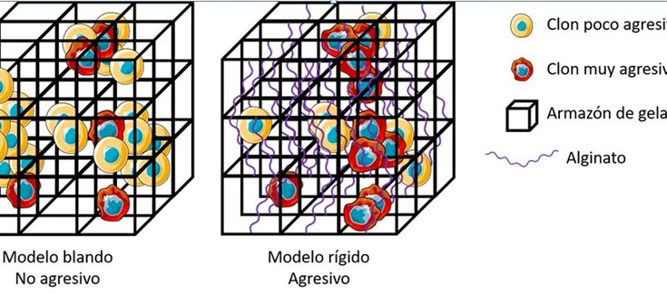Los modelos tridimensionales generados mediante bioimpresión permiten diseñar versiones simplificadas de los tumores de forma controlada, reduciendo la complejidad de los estudios. Sirviéndose de esta tecnología, se desarrollaron patrones de hidrogeles con tres rigideces distintas atendiendo a valores crecientes de alginato metacrilado para incrementarla. En estos modelos se cultivaron células neuroblásticas agresivas y se estudió su comportamiento a lo largo del tiempo.