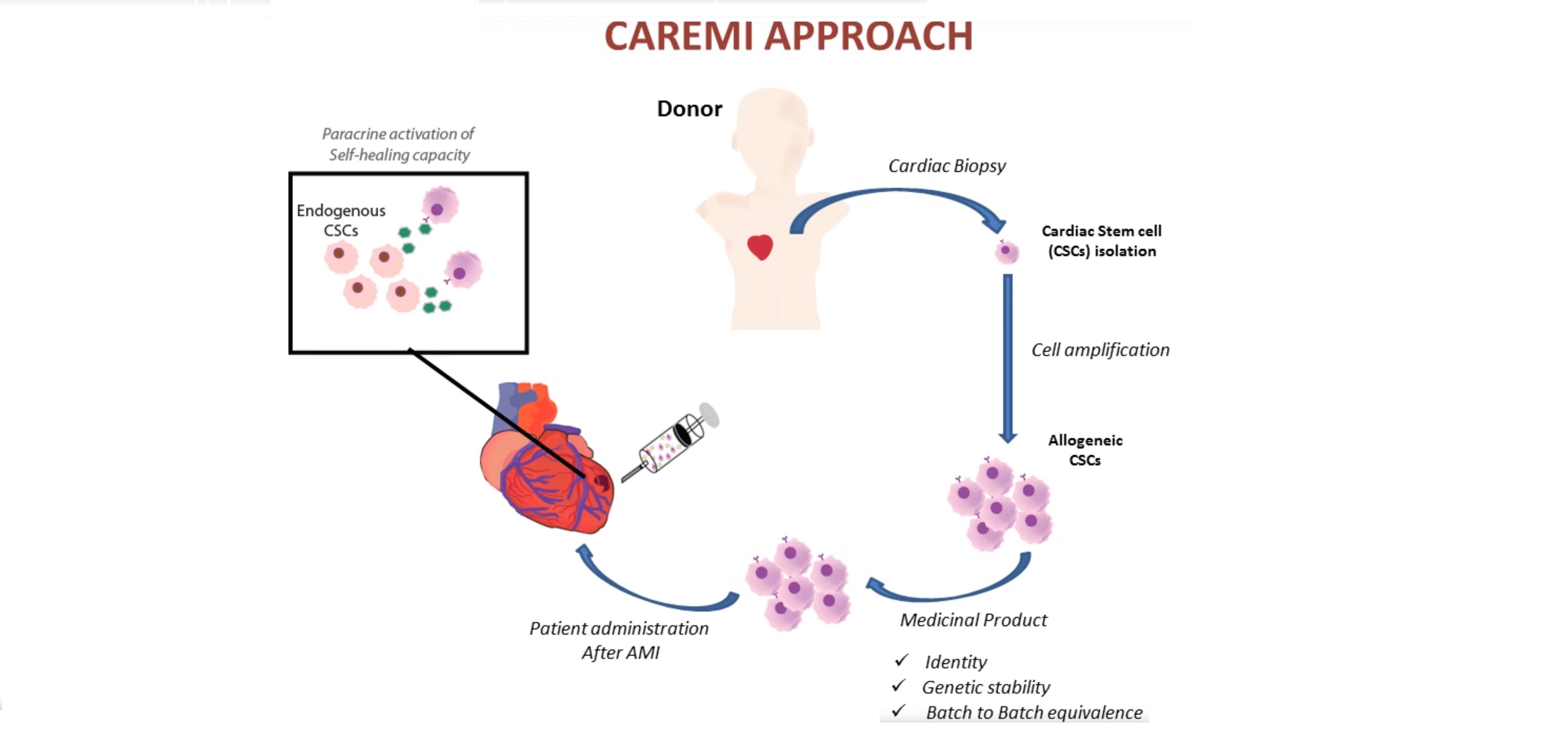 Con el objetivo de acercar estas terapias a la práctica clínica, en el estudio CAREMI se evaluaron dos innovaciones fundamentales. En primer lugar, las células se administraron en una fase muy temprana durante los días siguientes al infarto (entre 5 y 7 días después) gracias a que esas células eran de origen alogénico, es decir, de 3 donantes supuestamente no compatibles con los receptores que determinan la inmunidad. Además, esta investigación incluyó un estudio exhaustivo de resonancia magnética para evaluar la eficacia de este tratamiento sobre el tamaño del infarto y otros parámetros funcionales o estructurales del corazón.