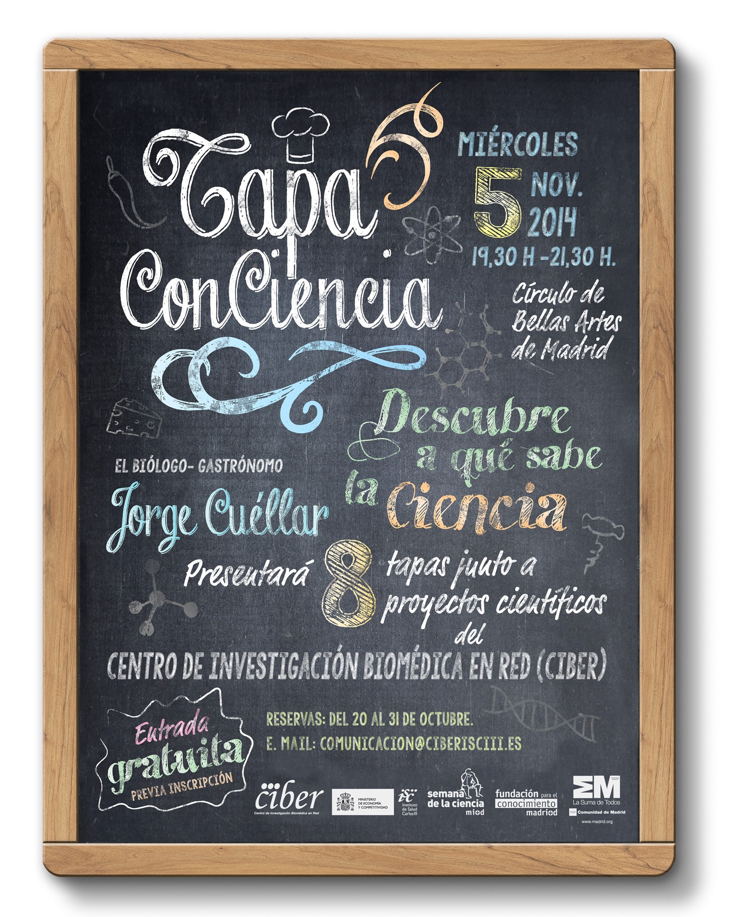 El evento será presentado por el biólogo-gastrónomo Jorge Cuéllar y consistirá en un showcooking con ocho tapas inspiradas en ocho proyectos científicos, que a su vez serán presentados por investigadores del CIBER. La entrada para asistir es gratuita con previa inscripción, y para ello es necesario ponerse en contacto con la dirección de correo [email protected], entre el 20 y el 31 de octubre.