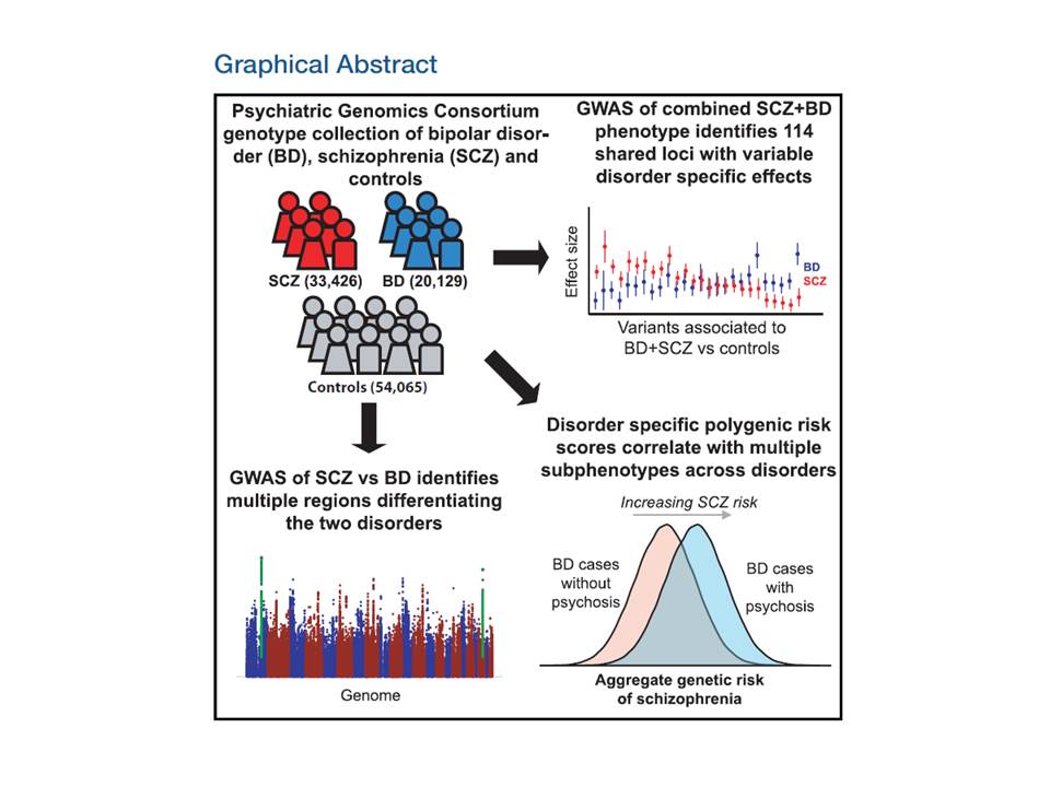 Al comparar los pacientes con esquizofrenia y los pacientes con trastorno bipolar (23.585 vs 15.270, respectivamente) se identificaron 4 regiones genómicas que contribuyen a las diferencias biológicas entre ambos trastornos. También se identificaron múltiples firmas genómicas que se correlacionan entre un trastorno y un síntoma clínico en el otro trastorno. Por ejemplo, se halló que los marcadores de riesgo poligénico para trastorno bipolar (PRS, polygenic risk score, que son una medida cuantitativa de la carga genética individual) se asociaban con la presencia de síntomas maníacos en pacientes con esquizofrenia.