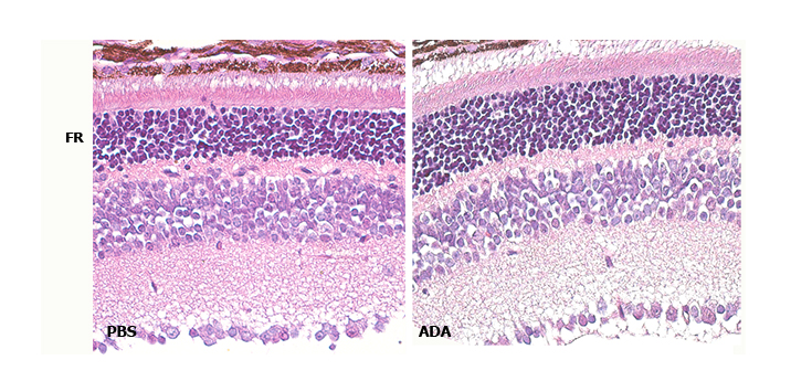 *Imagen hematoxilina y eosina mostrando que el bloqueo intravítreo de la citoquina TNFα con anticuerpos monoclonales tipo Adalimumab (ADA) reduce la degeneración de la retina, previniendo la muerte de los fotorreceptores (FR) en el modelo murino de retinosis pigmentaria, ratón rd10.