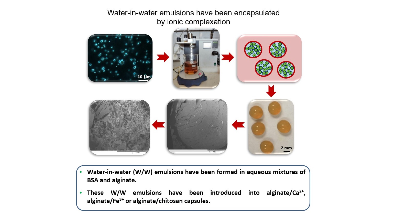 En la investigación se prepararon emulsiones de agua en agua (W/W) en mezclas acuosas de un polielectrolito aniónico (alginato de sodio, NaAlg), con albúmina de suero bovino o BSA, ampliamente usada en muchos procedimientos de bioquímica. "Esta combinación mostró separación de fases a dos intervalos diferentes de pH y se estudió su comportamiento de fase. Se obtuvieron emulsiones de BSA en alginato y se vertieron en soluciones de Ca2 +, Fe3 + o quitosano, formando cápsulas con diámetros alrededor de 2-4 mm, por complejación iónica de alginato de sodio, ubicado en la fase continua de las emulsiones" explica Jordi Esquena, investigador del CIBER-BBN en el IQAC-CSIC y responsable del estudio.