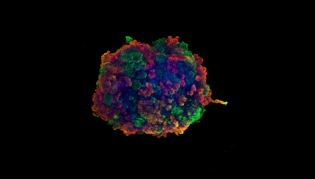 Imagen: microscopía confocal de un organoide de riñón generado in vitro a partir de células madre pluripotentes humanas que han sido diferenciadas durante 20 días usando cultivos tridimendionales. Estos organoides de riñón contienen estructuras renales que incluyen túbulos proximales (marcados con LTL, en verde) y podocitos (que expresan PODXL, en rojo) que se asemejan en parte a las estructuras renales del riñón humano.