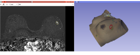 En este nuevo trabajo llevado a cabo por el Grupo de Tecnologías de Imágenes Biomédicas (Biomedical Imaging Technologies BIT) de la UPM y del CIBER-BBN, que ha contado con la colaboración del Hospital General Universitario Gregorio Marañón, el Hospital HM Sanchinarro de Madrid y la UC3M, se ha desarrollado una técnica que permite estimar la localización del tumor en la posición quirúrgica, lo que puede proporcionar una metodología alternativa o complementaria a los actuales métodos de localización preoperatoria utilizados en la práctica clínica. El nuevo método combina la información de la imagen preoperatoria con la de la superficie de la paciente, adquirida en el quirófano utilizando un escáner óptico, y así se consigue determinar la posición del tumor en la posición de la cirugía.
