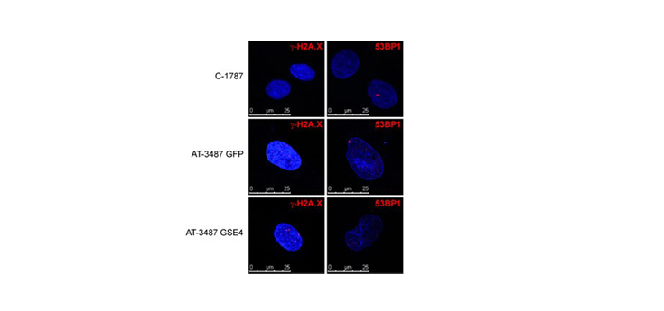 Detalle de la detección de proteínas que indican daño genético: H2A.X y 53BP1, detectadas en el núcleo celular utilizando anticuerpos específicos, en células controles (sanas) C-1787, o de un paciente de ataxia telangiectasia AT-3487 GFP o las células del paciente expresando el péptido GSE4. Se puede observar mas puntos rojos correspondientes a daño genético en las células AT-3487 GFP, que disminuyen en número en las células expresando GSE4.