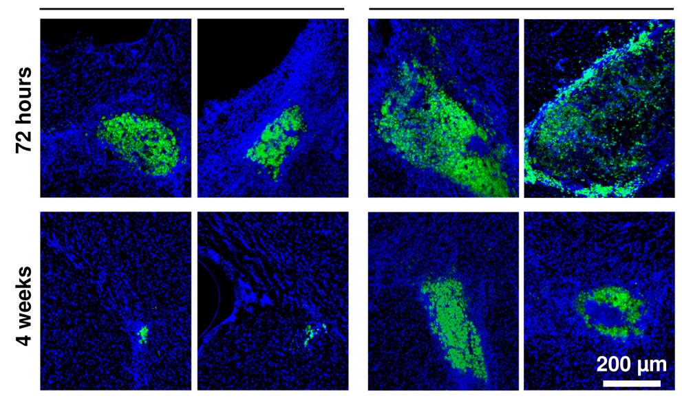 Imágenes de microscopia de fluorescencia mostrando células madre (en verde) injertadas en el tejido cerebral (azul). Los cuatro cuadros de la izquierda muestran la supervivencia de células madre implantadas sin encapsular, y los cuatro de la derecha la de células encapsuladas en hidrogeles de fibroína de la seda. Fuente: Front Cell Neurosci. 2018 Sep 6;12:296. doi: 10.3389/fncel.2018.00296