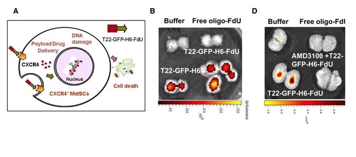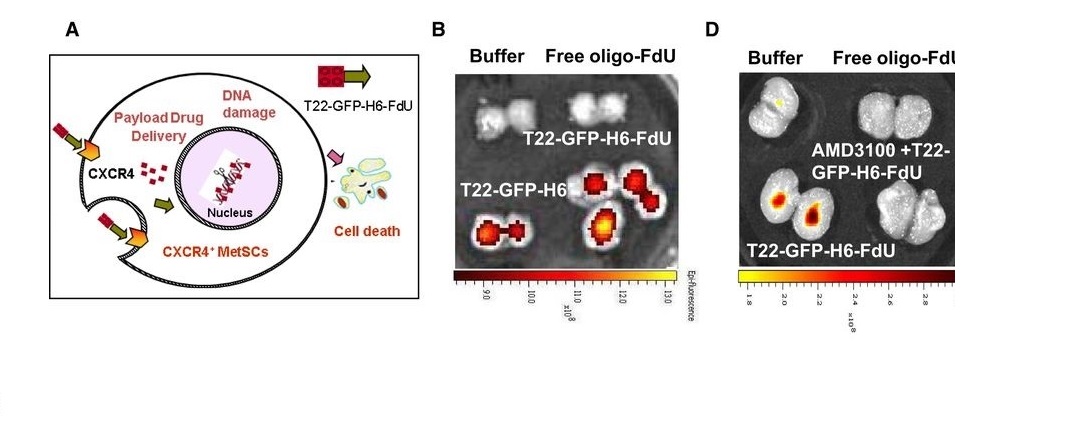 A. Approach to achieve targeted drug delivery and selective killing of metastatic stem cells: CXCR4‐nanoconjugate interaction triggers CXCR4‐mediated internalization in MetSCs, in primary tumors and metastatic foci, followed by FdU release to the cytosol and diffusion to the nucleus to induce double‐strand breaks leading to selective killing of CXCR4+ cells.